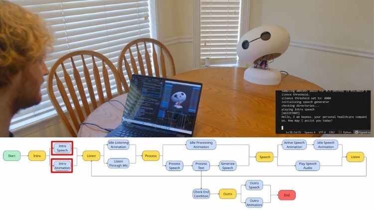 Maker Brae Barnes is developing a conversational Baymax-style robot that combines animatronic motion with an AI-driven speech system. The current prototype focuses on the head assembly, featuring articulated neck movement, blinking eyelids, and the ability to respond to spoken input using a speech-processing pipeline. The goal is to create a robot that not only talks but also conveys expression through physical motion, similar to professional animatronics.