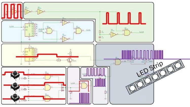 To achieve this, the creator builds a clock source using a 74HC14 Schmitt-trigger oscillator running around 720 kHz, then shapes that signal into both long and short pulses to represent binary “1” and “0” A binary counter sequences the required 24-bit data frame for each LED, while logic gates carve this stream into three timing windows for Green, Red, and Blue. Pressing a color button selectively replaces short pulses with long ones during the appropriate window, effectively programming the LED color in real time using pure hardware.