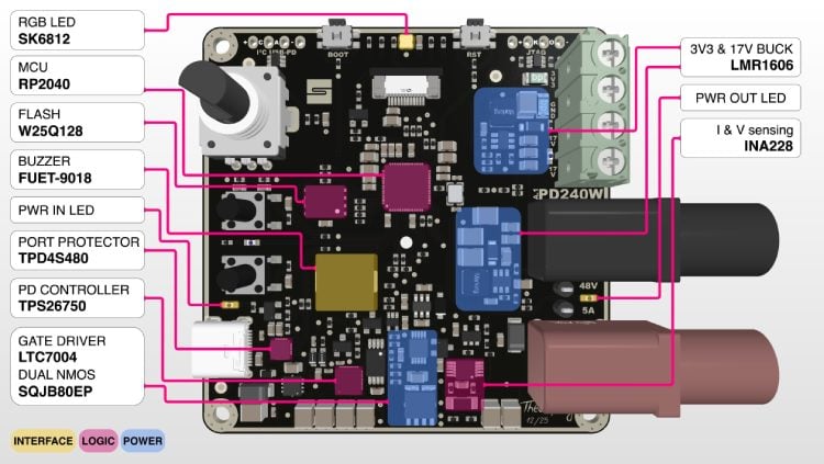 The hardware is built around a custom PCB that integrates the RP2040 with a dedicated USB Power Delivery controller, allowing the device to request and manage power contracts from the charger. Output power is switched using a high-side MOSFET driver, and voltage and current are monitored in real time using a precision power monitor IC, enabling adjustable current limiting and basic protection features. The board also includes temperature sensing for thermal monitoring, along with electrostatic discharge protection on the USB-C interface.