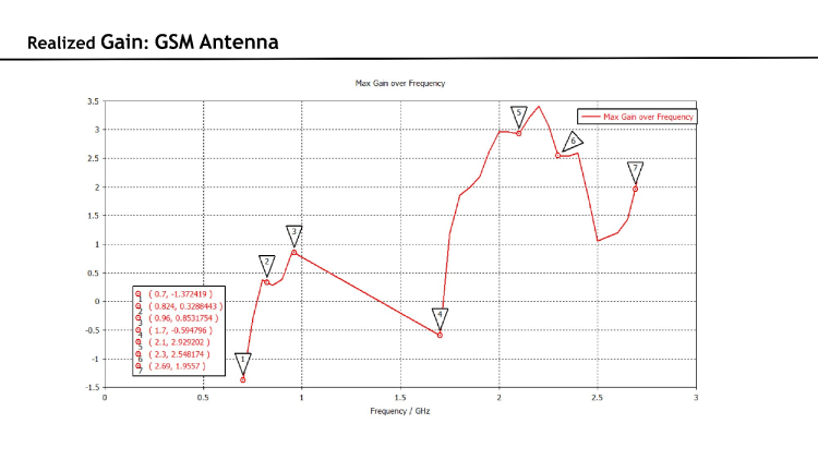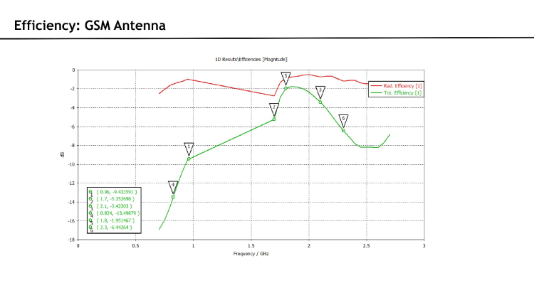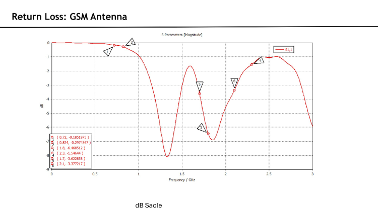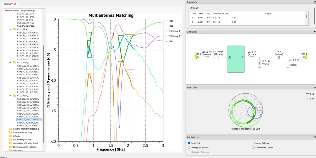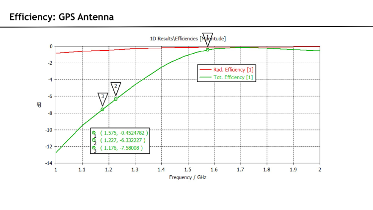 The matching network transforms each port’s antenna impedance to 50 Ω , achieving −2.5 dB efficiency on GPS and −4.9 dB on GSM. The GPS port uses a two-element series ladder C1 suppressing GSM-band interference and L1 resonating out the capacitive reactance – for a narrowband match at 1.575 GHz, while the GSM port uses a four-element ladder where L2/L3 transform the high reactive impedance at 900 MHz and C2/C3 refine the match at 1800 MHz and suppress energy above 2 GHz, with the −4.9 to −6.3 dB GSM efficiency.