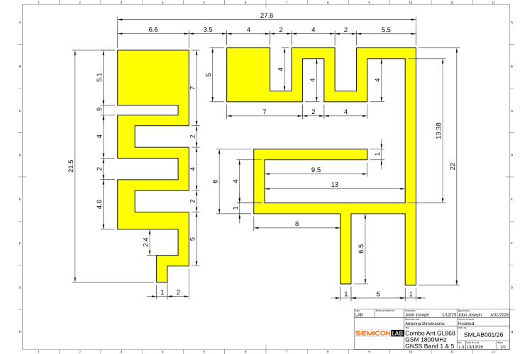The image shows the the antenna layout. The left one is for GNSS/ GPS , while the second one is for GSM. The antenna is a two-port PCB trace structure tuned to cover the GSM and GPS bands concurrently. The radiating elements, feed traces, and ground plane clearances were all co-designed specifically around the GL868 module layout. A lumped-element matching network is placed between the antenna feed points and the module RF pins to bring both ports to a 50 Ω reference impedance across their respective operating bands.
