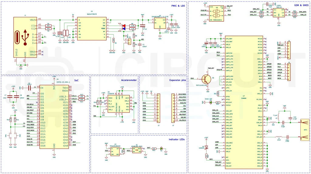 The schematic for the GL868_ESP32 is organised into six logical sub-circuits: the power section, the SIM868 modem interface, the ESP32-S3 microcontroller connections, the motion sensor, the indicator LEDs and the expansion pins. Each block is described below.