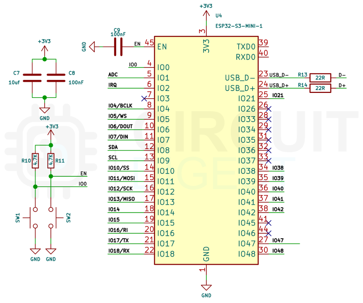 The ESP32-S3-MINI-1 module lands on the one edge of the PCB. Its boot and reset buttons (SW1 on IO0, SW2 on EN) are accessible for firmware flashing. The USB D+ and D− signals from the USB-C connector (J1) route through 22 Ω series resistors (R13/R14 and R22/R23) directly to the ESP32-S3’s internal USB-Serial/JTAG controller – no separate USB-to-UART bridge IC is needed, reducing component count and cost. All the GPIOs that were used internally for the flash and PSRAM are left unconnected. All remaining available GPIOs are brought out to the expansion header for user convenience.