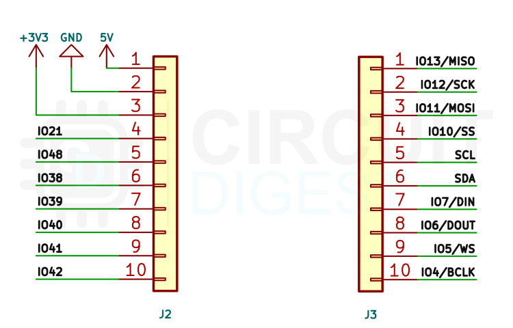 On the GL868_ESP32 you can see four different expansion headers. Two of them are connected to the ESP32-S3 SoC. As you can see the J2 and J3 contains all the necessary pins brought out, including power pins 5V, 3V3 and GND, along with the I2C (Shared with onboard accelerometer), SPI, I2S, ADC, Touch and other remaining GPIO pins.