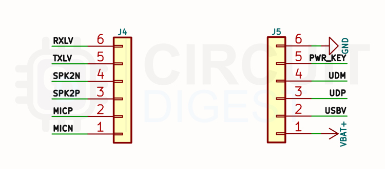 The expansion headers J4 and J5 are used for interfacing with the SIM868. The J4 brings out the SIM868’s UART1, Speaker Out (Connected to the Internal Class AB audio amplifier), Mic In. While the J5 brings out the SIM868’s KEY pin along with its USB pins.