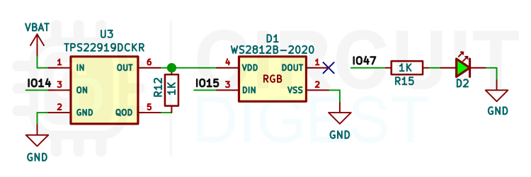 Apart from the charing indicators, the GL868_ESP32 comes with an additional addressable RGB LED along with a status indicator LED. For the RGB LED we are using a WS2812B addressable RGB LED in a 2020 package. An additional TPS22919 load switch is used to control the power to the WS2812B RGB LED, since even when it is not displaying any current , it will still draws a small amount of current. The load switch ensures that the RGB LED remains fully turned of during deep sleep mode to reduce energy usage. the load switch is controlled using the GPIO14, while the data for the addressable RGB LED is being controlled with GPIO15. GPIO47 is used to controlled the single colour status LED.