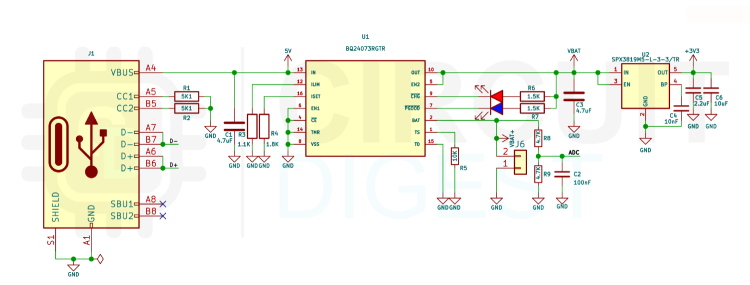 The board supports two simultaneous power sources: USB-C (5 V from the host) and a single-cell LiPo battery (3.0–4.2 V). The BQ24073RGTR (U1) manages both through an internal power-path switch. When USB is connected it powers the system directly from VBUS and simultaneously charges the battery; when USB is absent, the battery takes over seamlessly with no switching glitch. the charge current is set to 500mA using the current limit resistor R4. Even tough the BQ24073RGTR is capable of 1.5A charge current we have limited it to the 500mA to reduce heat and better performance. Two LEDs are used to indicate the charging status. The 5.1K resistors connected to the CC pins ensures that the GL868_ESP32 development board is compatible with all USB type c interfaces.