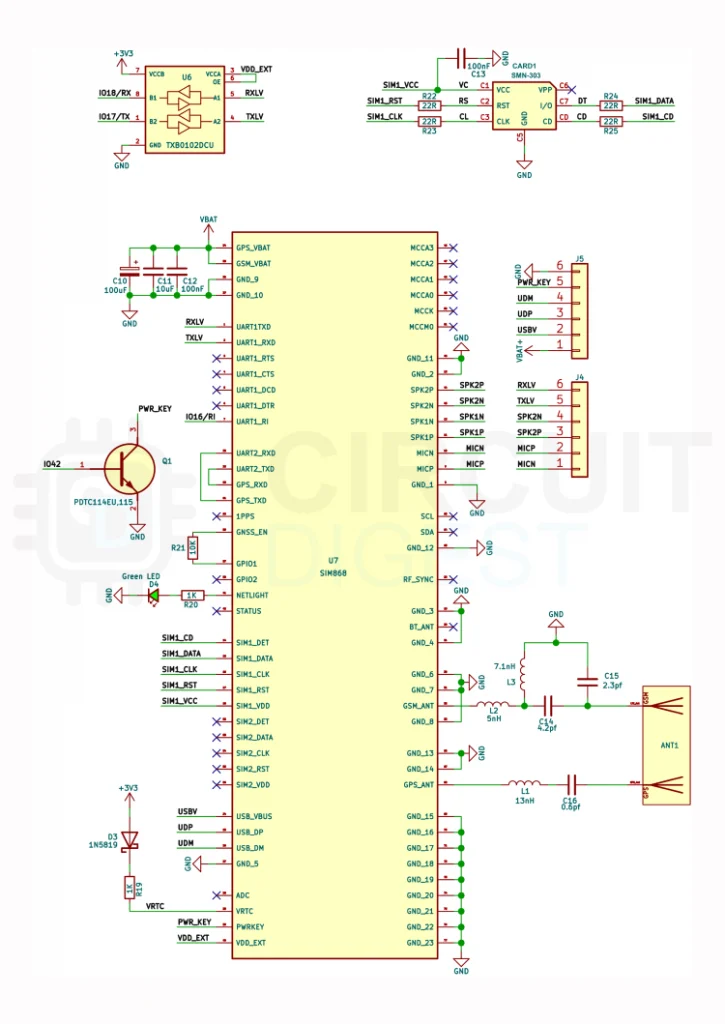 The SIM card interface routes SIM_CLK, SIM_DATA, SIM_RST, SIM_VCC, and the card-detect (CD) signal to the SIM868‘s internal SIM controller. Pull-up resistors on the SIM_DATA and SIM_CLK lines ensure clean signalling. The SIM1_VCC line is powered by the SIM868’s internal 1.8 V or 3.0 V SIM supply – no external SIM power circuit is needed.
