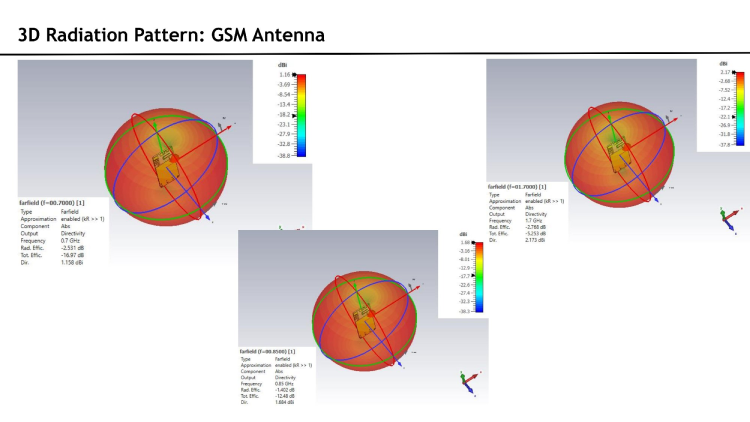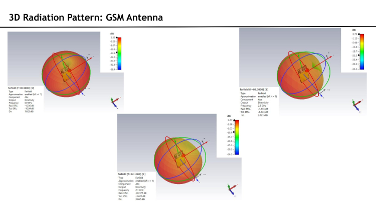 Simulated from 0 to 3 GHz. S1,1 shows a primary resonance at 1.8 GHz (−6.47 dB) and secondary resonances near 1.7 GHz and 2.1 GHz, covering GSM 1800/1900 and upper. Radiation efficiency is −1.2 to −2.8 dB across the upper GSM bands. Realised gain peaks at 3.3 dBi at 2.1–2.3 GHz. The 3D radiation pattern is near-omnidirectional at lower frequencies, appropriate for an asset tracking device deployed in unknown orientation.