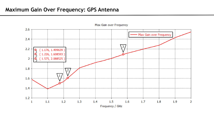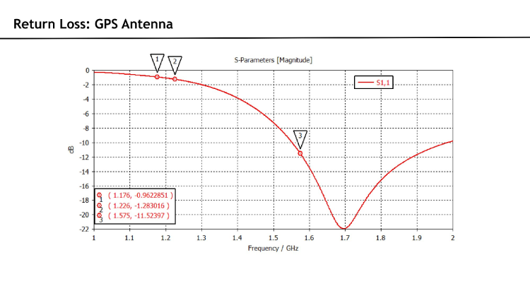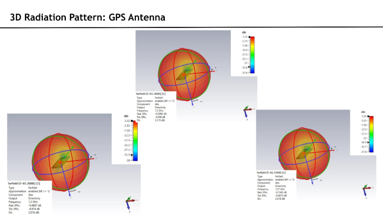 Simulated from 1 to 2 GHz. S1,1 shows a well-defined resonance at 1.575 GHz (−21 dB return loss), precisely aligned with GPS L1. Radiation efficiency is −0.13 dB and total efficiency −0.48 dB at 1.575 GHz. Realised gain is 2.09 dBi. The 3D pattern is broadly omnidirectional with good upper-hemisphere coverage across all simulated frequencies.
